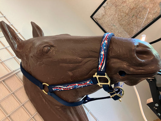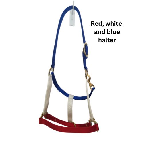 Patriotic Horse Halter, red white blue overlay, your choice of hardware color, dark blue nylon webbing