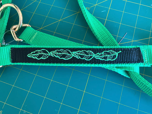 Custom embroidered horse halter leaf pattern, lime green with black overlay with green leaves, gold hardware