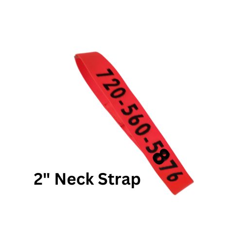 Personalized Horse Evacuation Identification Neck Strap; 2 inch wide Bright Orange Nylon Webbing; 2 inch by 4 inch Velcro "breakaway" connection; Embroidered Phone Number